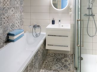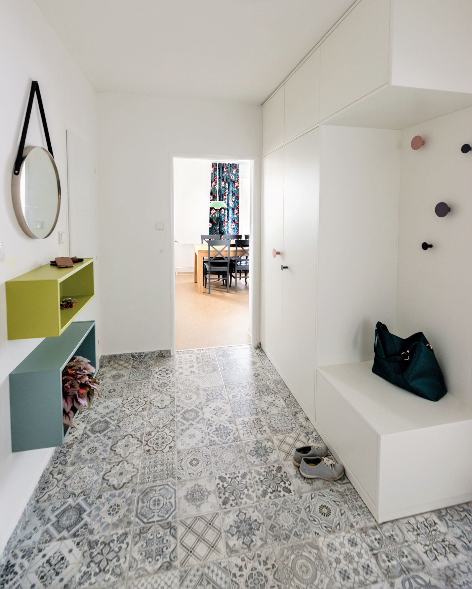 Samozřejmě bylo potřeba stávající povrchy, sanitu i nábytek kompletně vyměnit, nicméně snahou bylo vtisknout bytu atmosféru minulosti s použitím moderních a funkčních prvků. Právě proto je zde použita pestrá barevná škála počínaje mintovou a starorůžovou barvou, doplněnou modrozelenou a neutrálními odstíny šedé a béžové. Jedinečnou atmosféru bytu ale dodává dlažba, zvolená do vstupní haly, která putuje až na stěny koupelny. Důležitým detailem jsou také atypické úchytky nábytku v předsíni a v kuchyni.